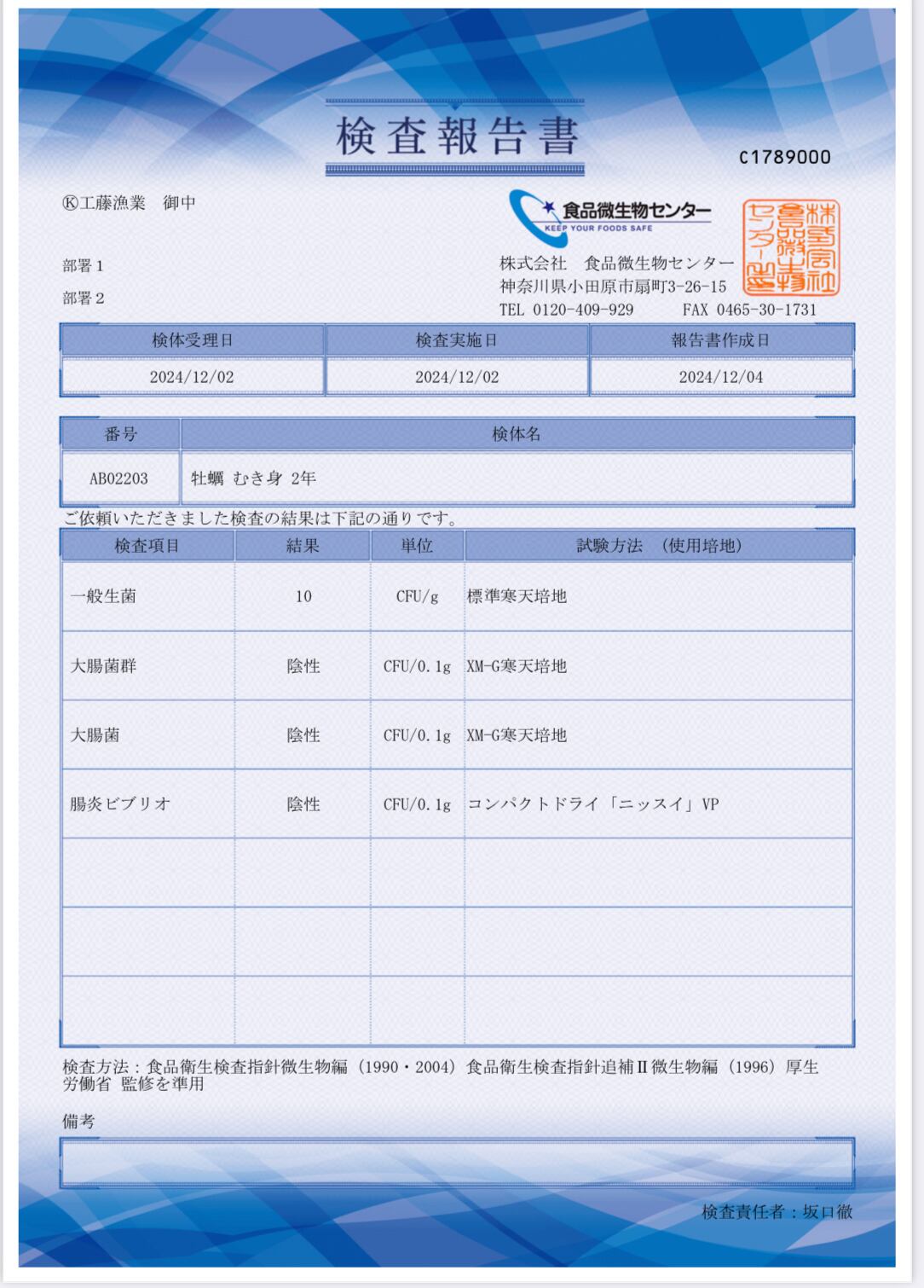Ⓚ工藤漁業が加工販売する『生食用 むき身パック』の商品については独自による商品検査(一般生菌検査等)を定期的に実施するとともに販売する全商品についても新鮮かつ安全安心な製品づくりへの品質管理を徹底し、情報を公開しております。